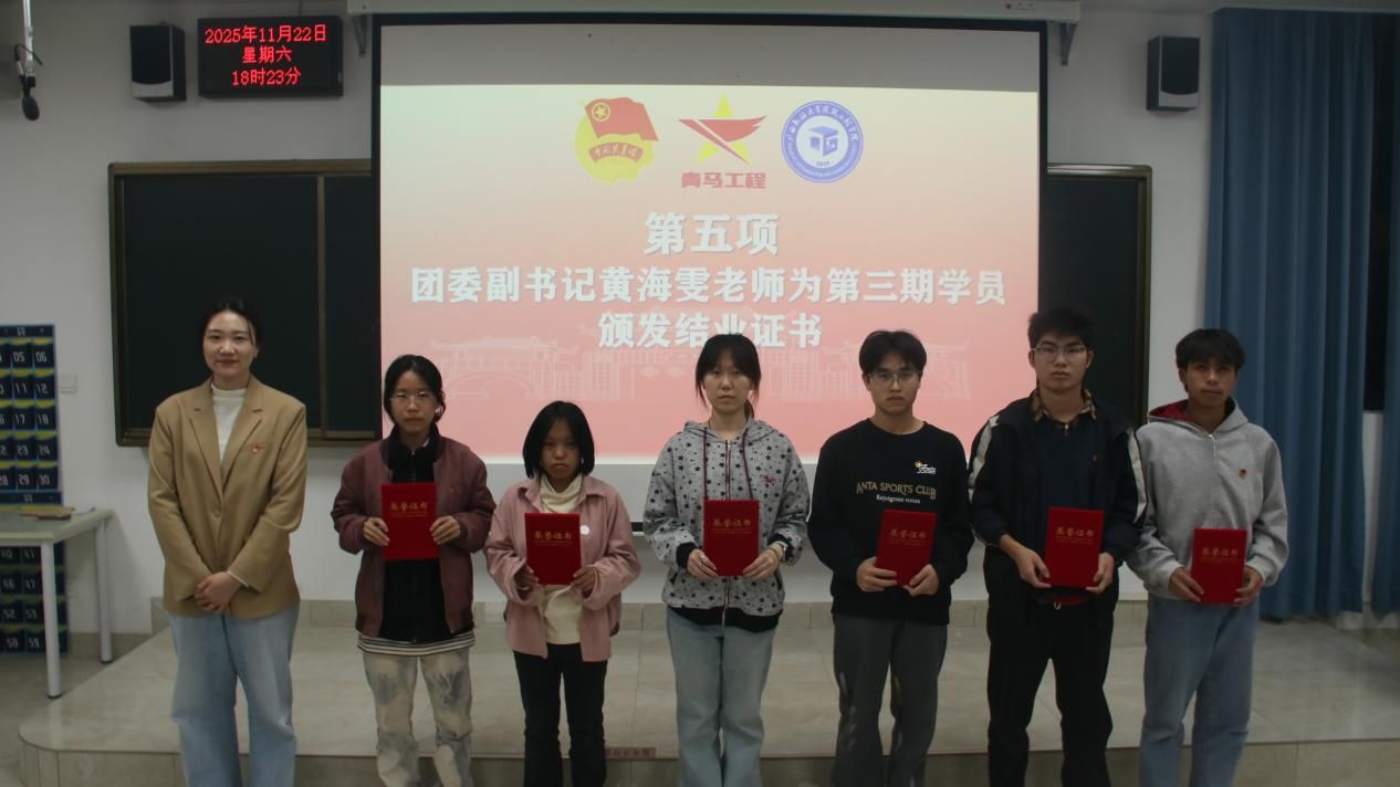 2025年11月22日,广西民族大学乐天堂f88“青马工程”大学生骨干培训班第三期结业仪式暨第四期开班仪式顺利举行。学院团委副书记黄海雯老师和学院“青马工程”第三、四期全体学员共同参与此次活动。