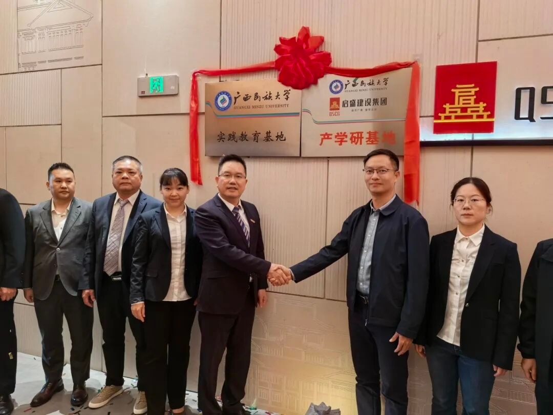 在全场人员的共同见证下,覃祖聪书记与邓国璋总经理共同为 “广西民族大学 - 启盛建设集团产学研基地”“ 广西民族大学 - 启盛建设集团实践教育基地” 揭牌,全体参会人员合影留念,铭记双方携手共进的合作初心。