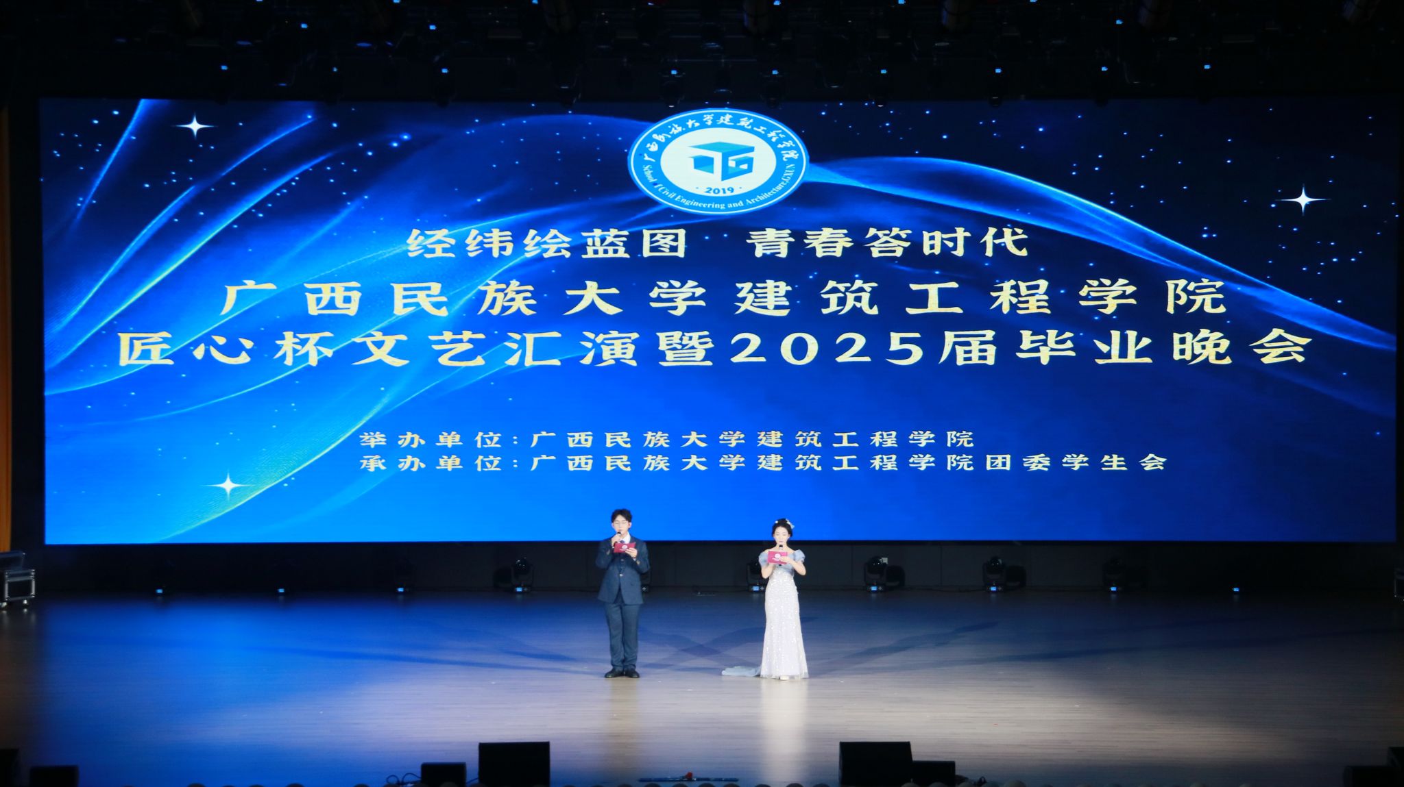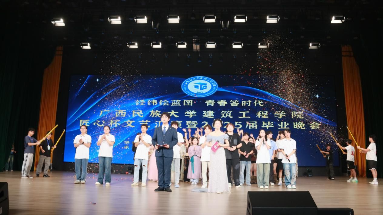 5月18日晚,广西民族大学乐天堂f88“经纬绘蓝图·青春答时代”匠心杯文艺汇演暨毕业晚会在武鸣校区大礼堂举行。本次晚会由乐天堂f88主办、团委学生会承办,通过歌舞、朗诵、小品等多种形式,为毕业生送上了一场充满温情与活力的告别仪式。全院师生及校友代表齐聚一堂,共同见证这一难忘时刻。