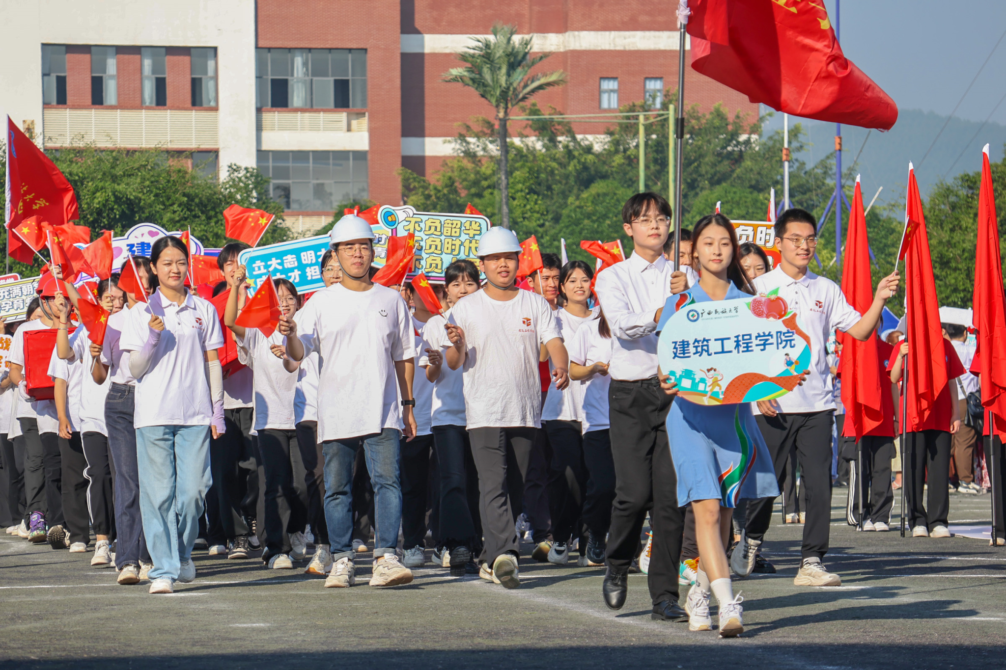彩旗飘扬,呼声震天。10月31日早上8点,广西民族大学2024年体育运动会在思源湖校区隆重开幕。建工学院方阵由一百名师生组成,场面热情昂扬,土木方块的同学娴熟利落的传递着方块,测绘方块表演作出认真严谨地模样,生动展示了我院的学科专业特色,展现我院风采。
