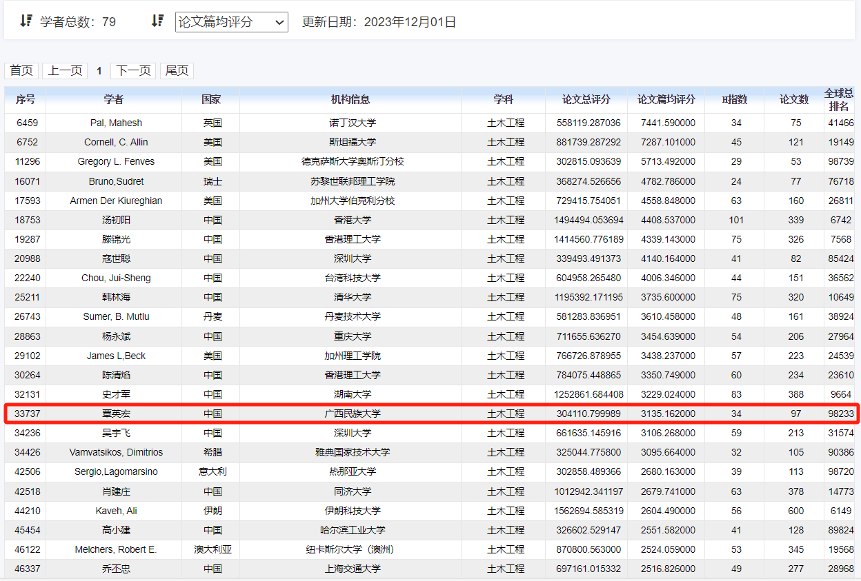 近日,全球学者学术影响力排名发布,该排名以学者的发表论文、期刊质量、论文被引频次以及作者贡献度为评价基准,旨在全面反映学者的学术影响力和贡献。土木工程学科共有国内外79位学者入选,我院覃英宏教授以其卓越的学术贡献和影响力成为我区唯一入选的土木工程学者。