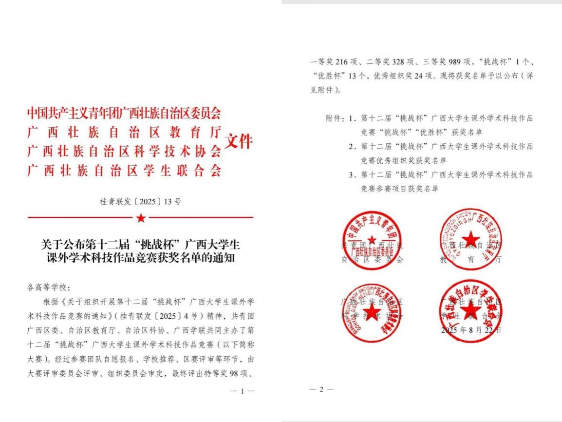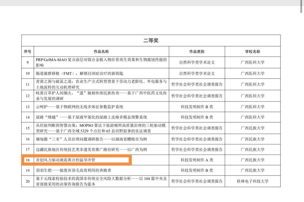 近日,第十二届“挑战杯”广西大学生课外学术科技作品竞赛结果揭晓,乐天堂f88参赛团队凭借原创项目“首创风力驱动液流离合控温导冷管”荣获科技发明制作A类二等奖,为学院科技创新成果再添重要荣誉。